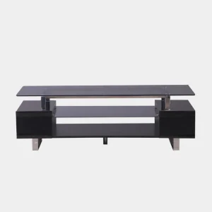 A Modern Contemporary tv stand with glass top, sliding drawer and open shelf MDF board in high gloss finish with tempered glass top. Size: L150xW45xH49.5 cm