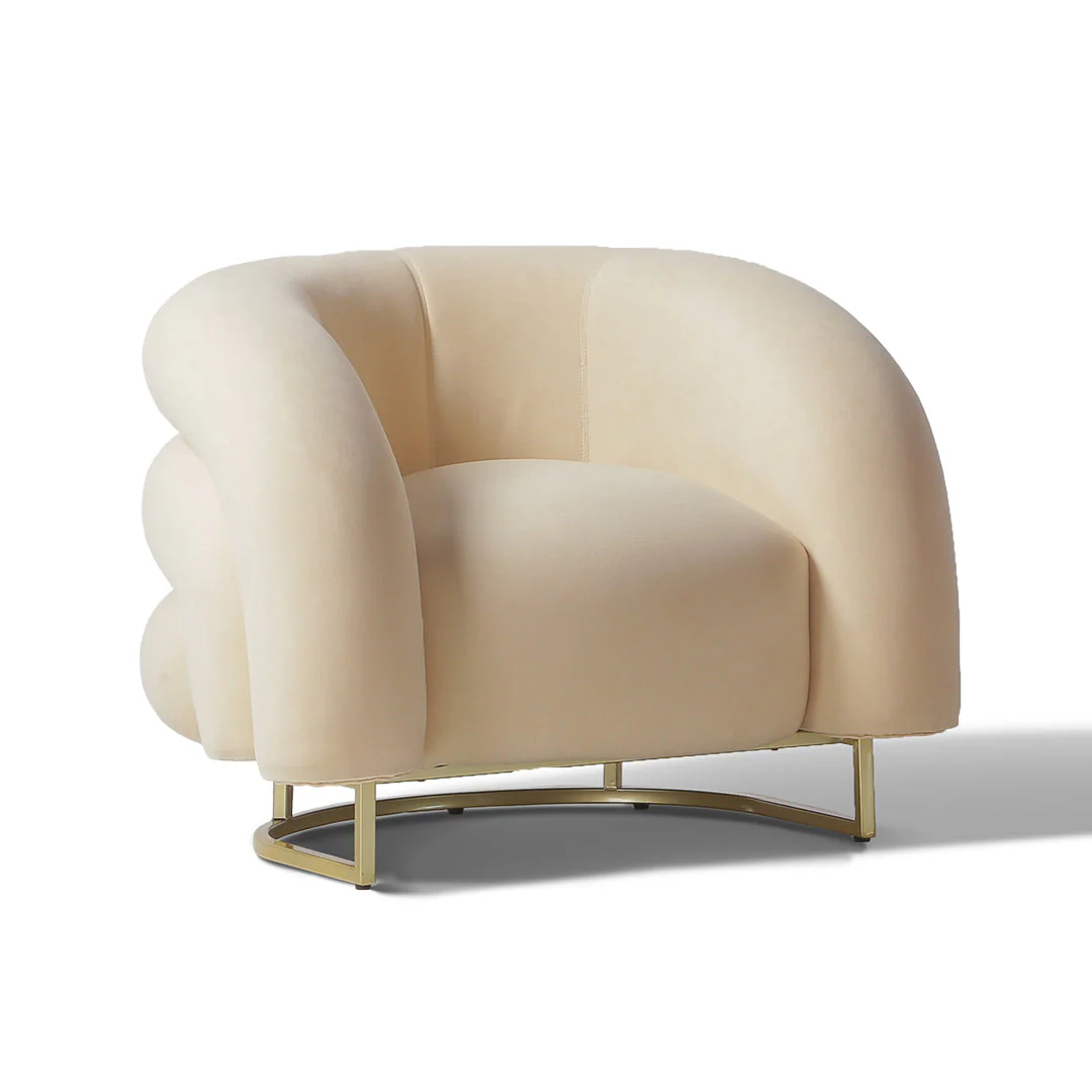 A Modern Contemporary accent chair with soft curve detailing, fully padded with high density rebound sponge and upholstered in flannel fabric, fitted with curved metal legs.