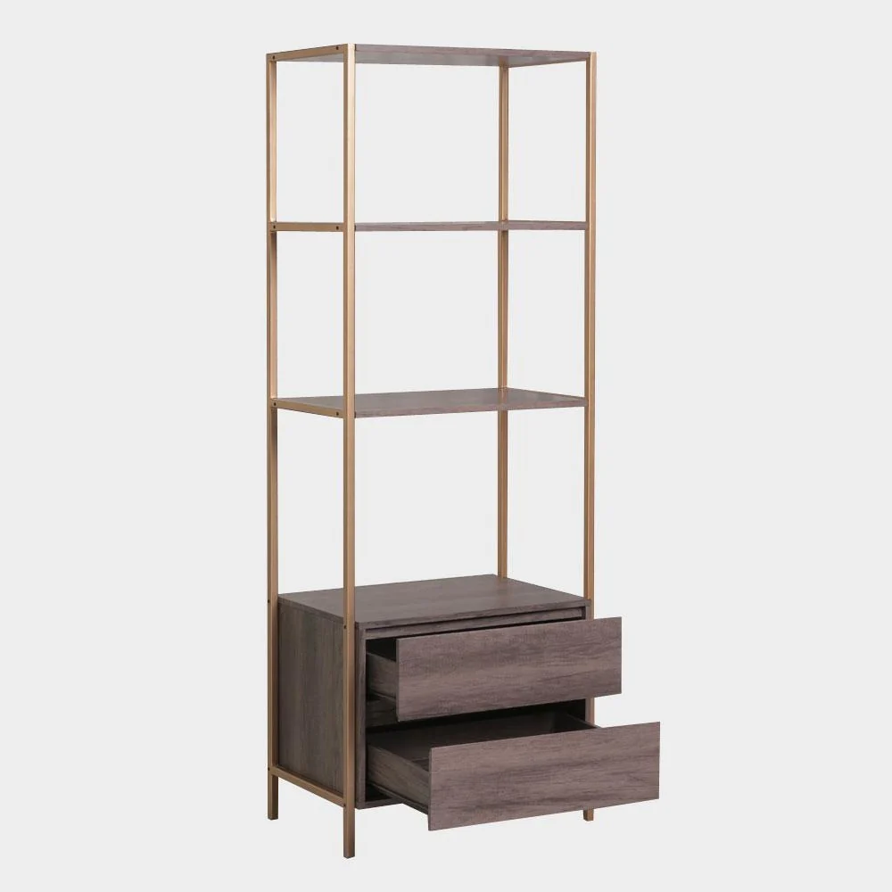 A Modern contemporary shelving with drawers made from medium density fiber board, laminated with imported vinyl and legs in metal antique gold finish.