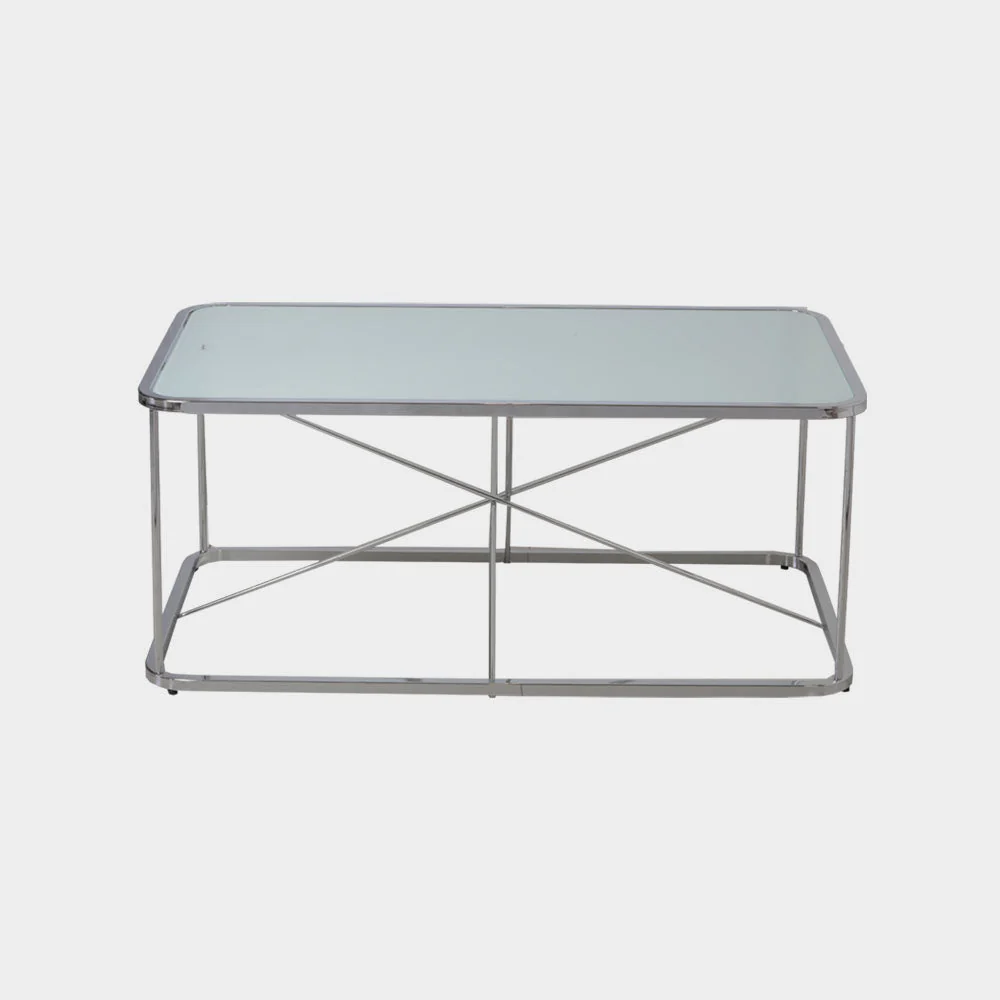 A Modern Contemporary center table made from 20mm square tube, round tube in chrome, and 5mm mirror glass top.
