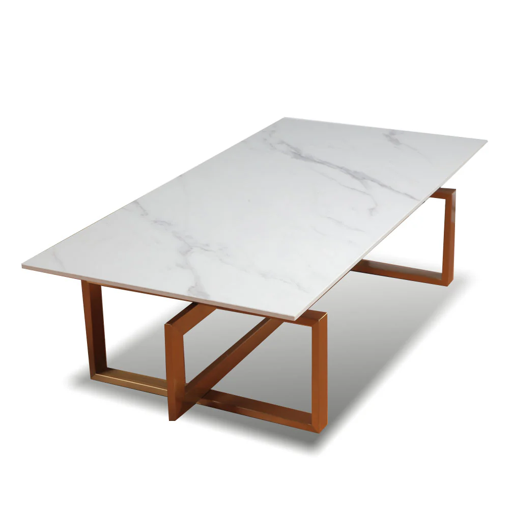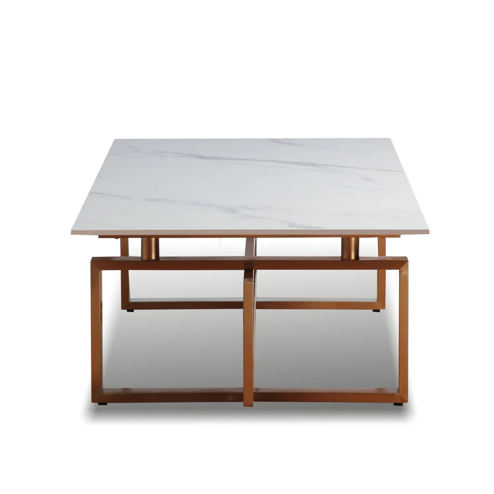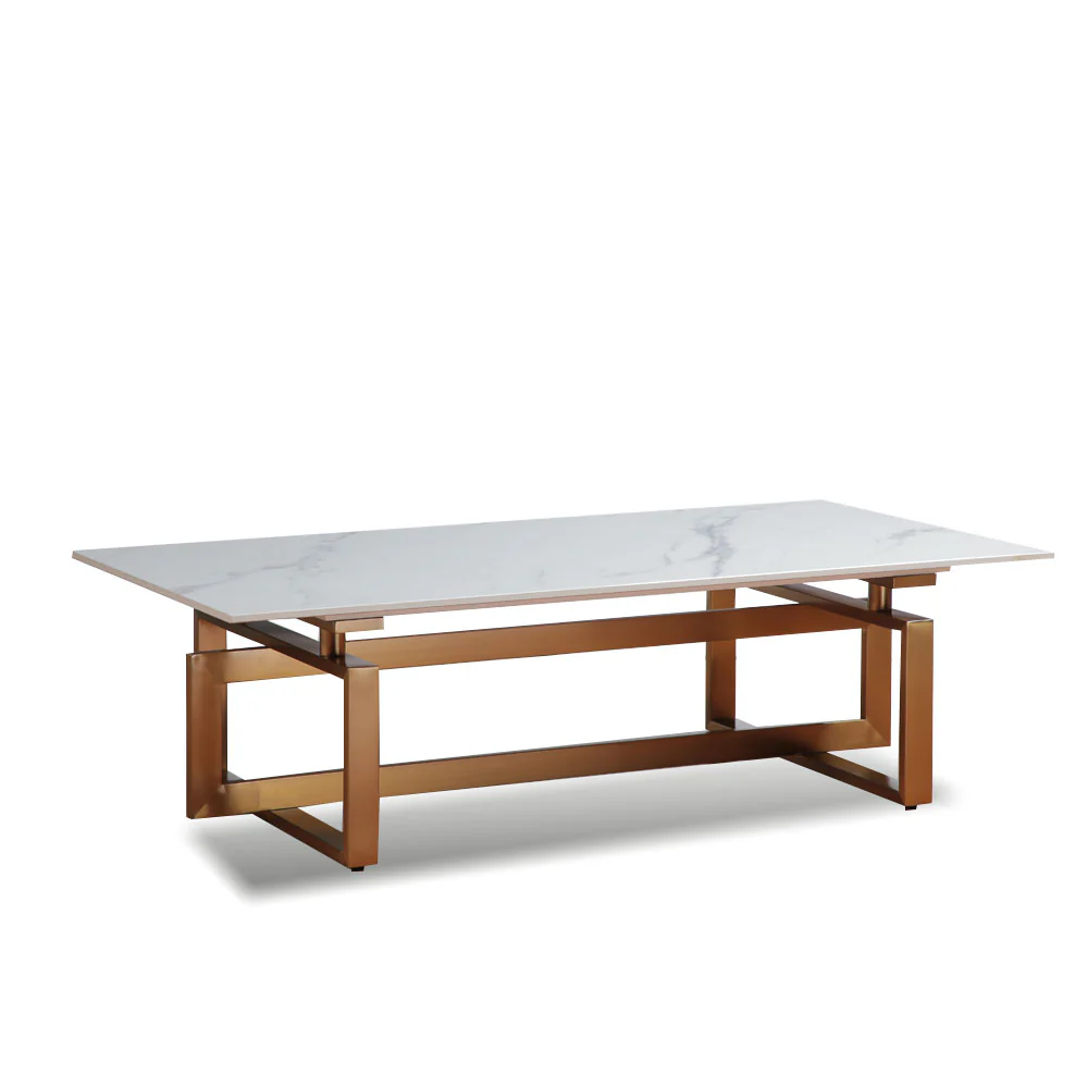 A Modern Contemporary style center table with stainless steel legs in brushed plated gold finish and 12mm thick solid white ceramic table top.