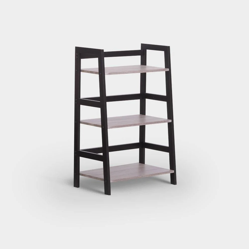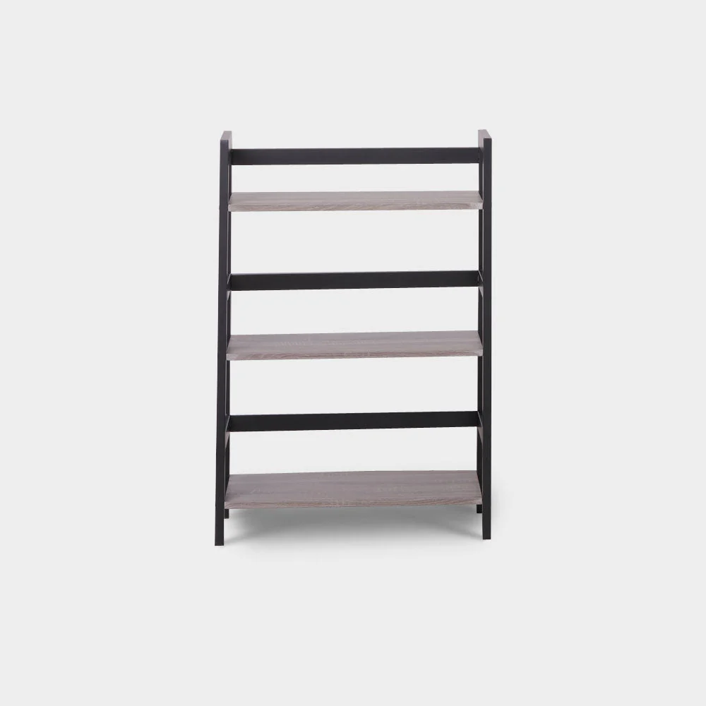 An Industrial style shelf with 3 layers made from particle board with powdercoated metal framing.