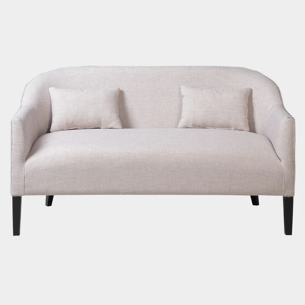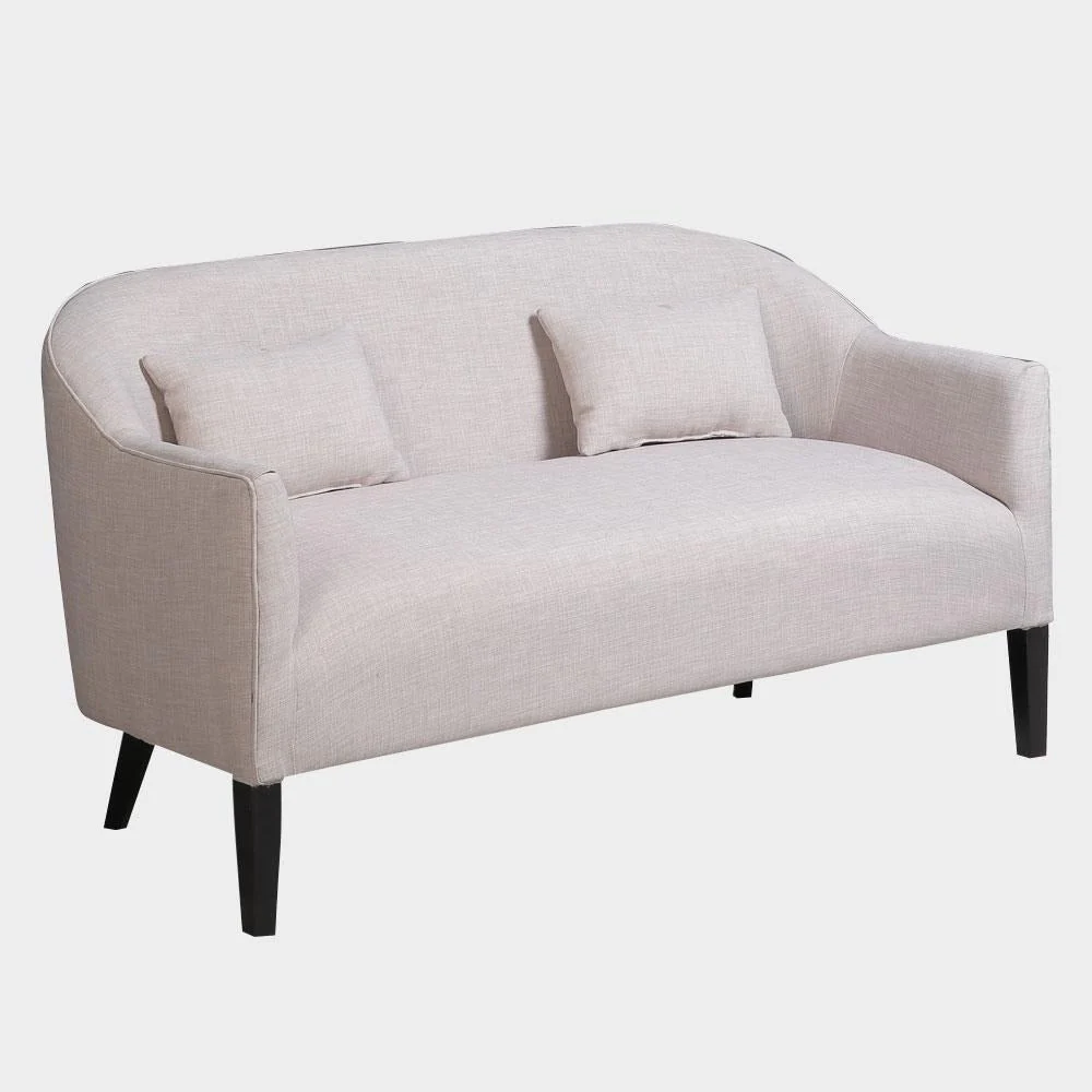 A Mid-Century Modern slim curvilinear sofa upholstered with fabric frame made from solid wood.