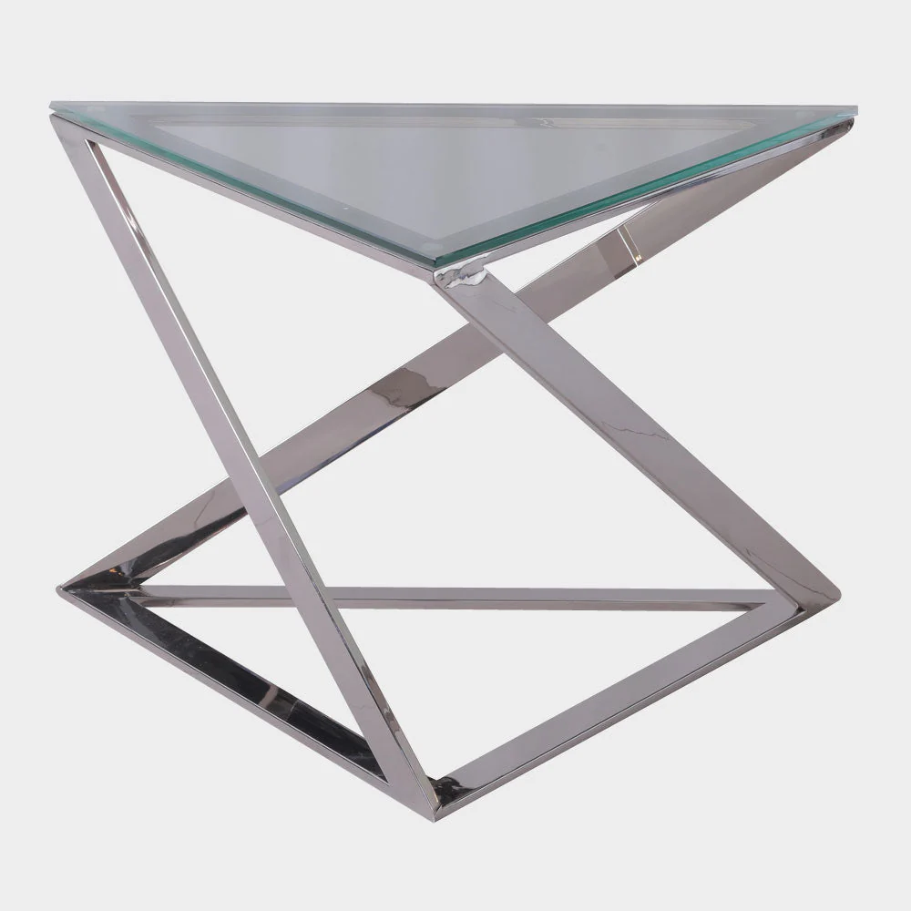 A Modern Contemporary triangular side table with clear tempered glass top and metal chrome legs in silver finish.