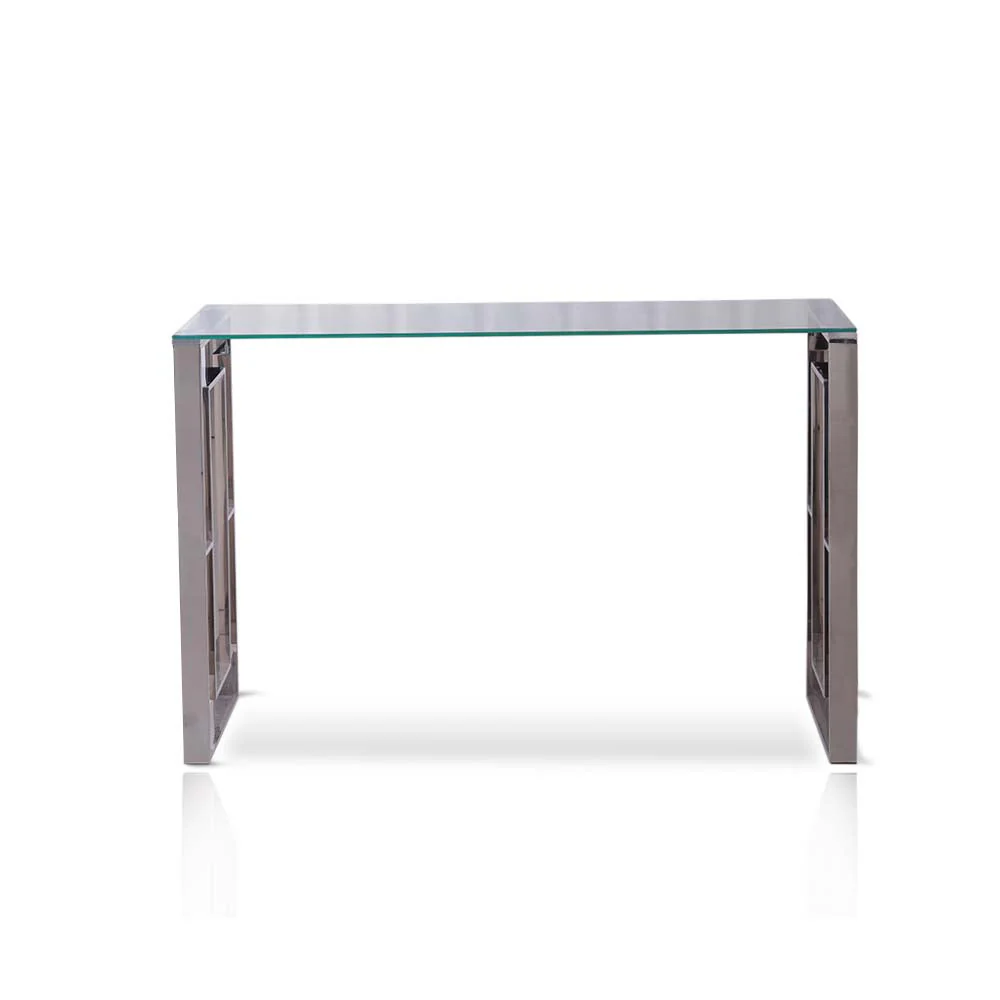A Modern Contemporay style console table made with metal chrome framing with clear tempered glass table top.