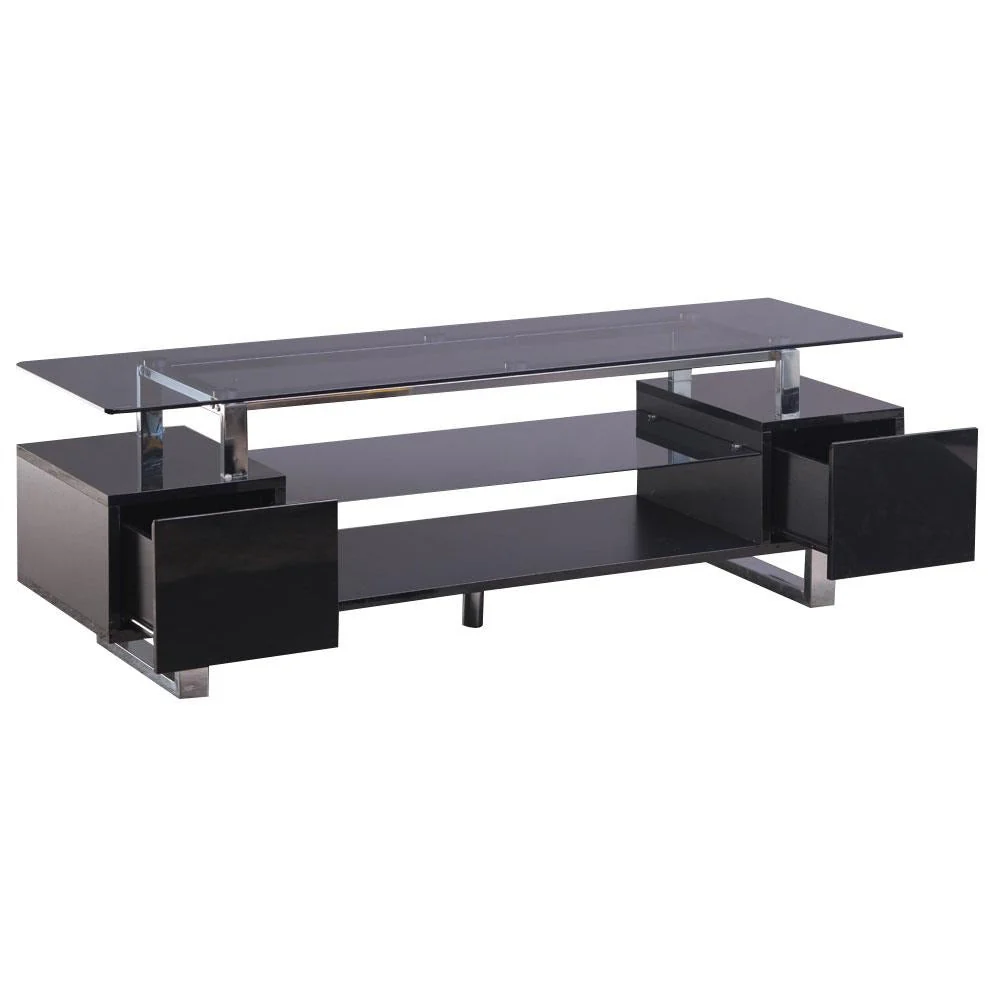 A Modern Contemporary tv stand with glass top, sliding drawer and open shelf MDF board in high gloss finish with tempered glass top.