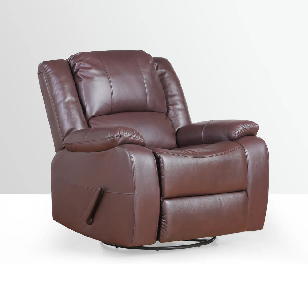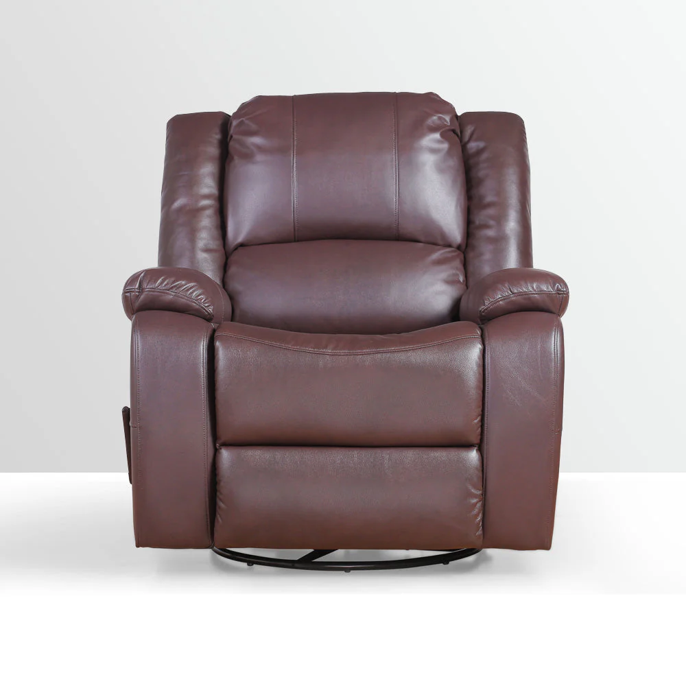 A Modern Contemporary style swivel recliner, fully padded and upholstered in air leather.