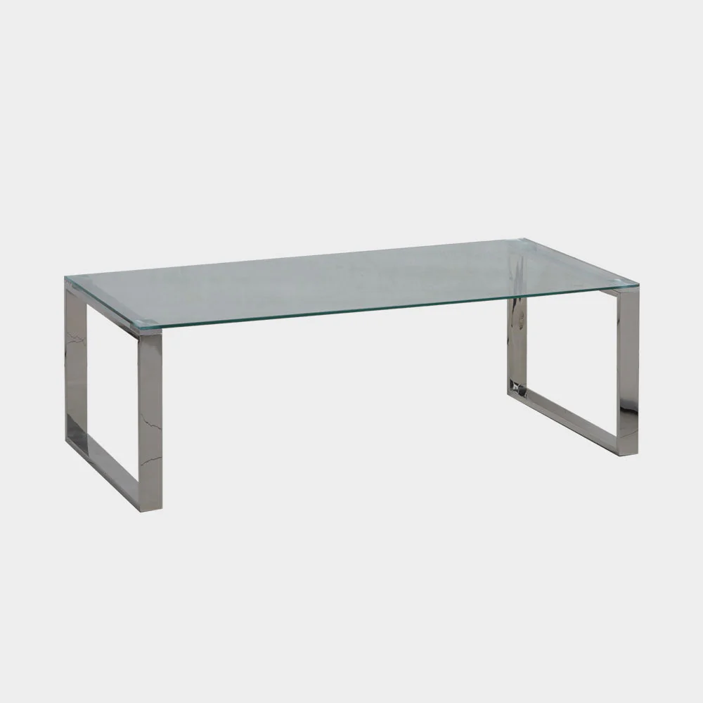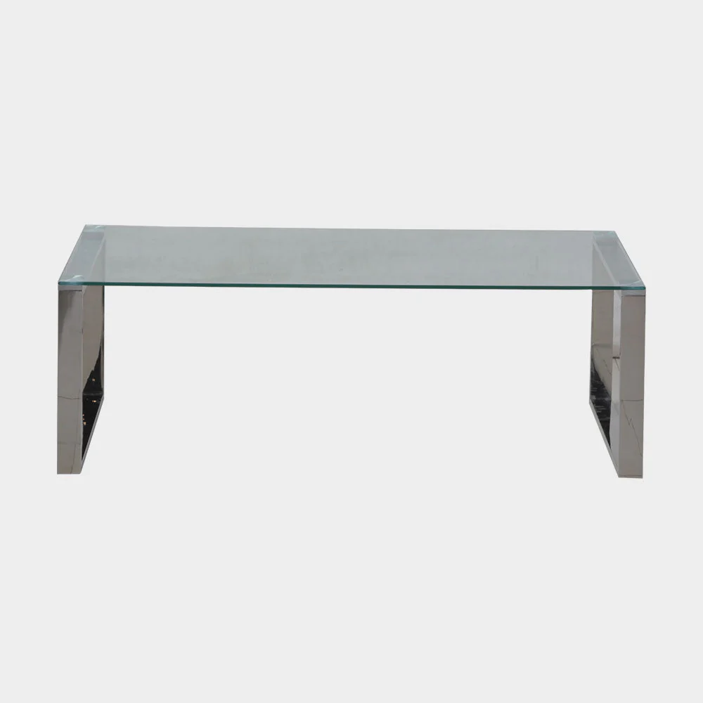 A Modern Contemporary center table in a clean linear design. Clear tempered glass with metal chrome legs in silver finish.