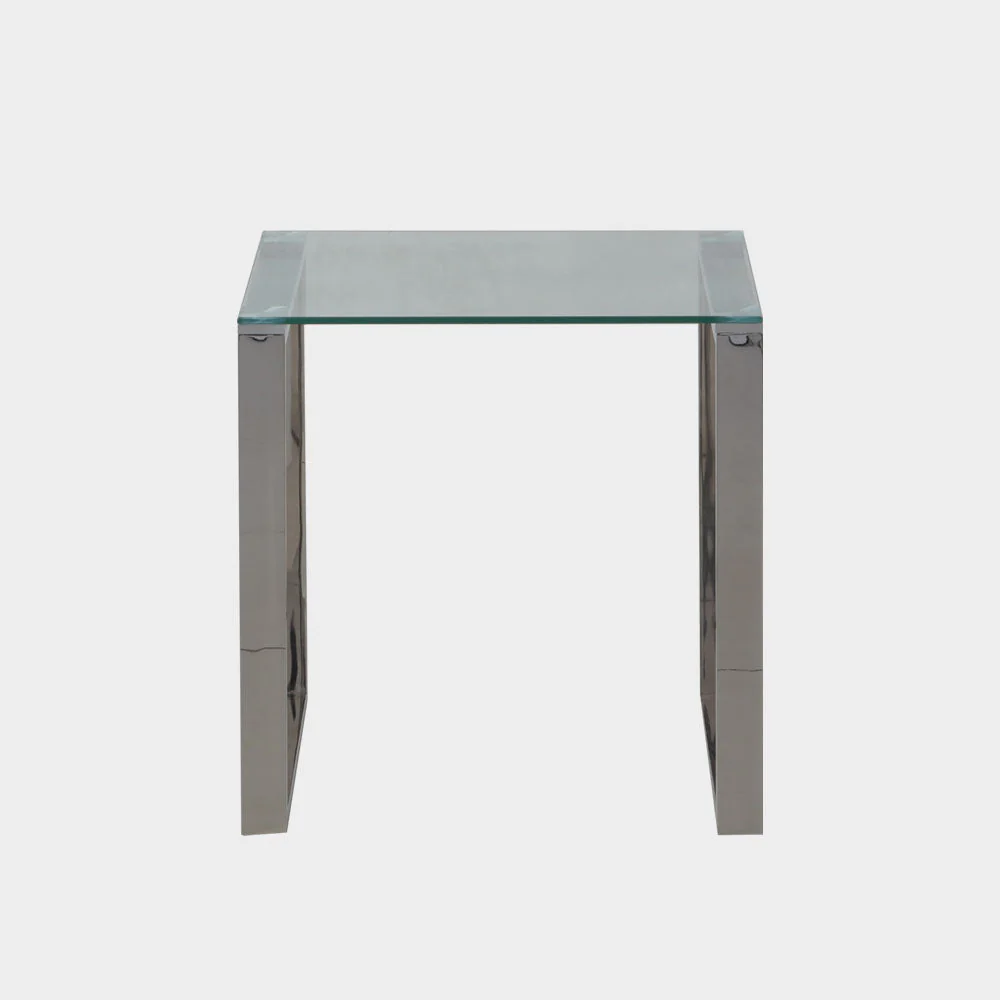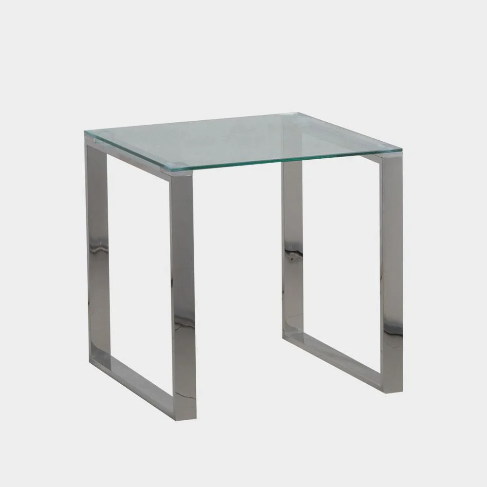 A Modern Contemporary side table in a clean linear design. Clear tempered glass with metal chrome legs in silver finish.